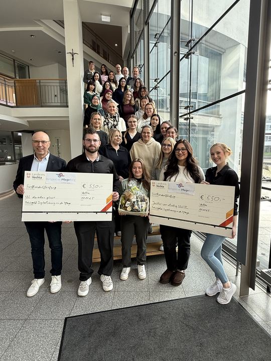 Erstmals führte der Verein Perspektive: Pflege! e.V. in diesem Jahr das Schülerprojekt zum Thema Digitalisierung und KI in der Pflege durch. Hierbei handelte es sich um einen Kreativwettbewerb zwischen den Berufsfachschulen des Landkreises Vechta, in dem Teams aus den Schülerschaften innovative Konzepte aus dem Bereich Digitalisierung ausgearbeitet und am 17.11. im Kreishaus vorgestellt hatten. Sowohl die Justus-von-Liebig BBS III mit den Smart Health Glasses als auch die Marienhain gGmbH mit KI-Konzepten für den Stationsalltag überzeugten mit ihren Projekten und dem damit verbundenen Engagement. Beide Gruppenprojekte fokussierten sich in ihrer Arbeit auf den praxisorientierten Einsatz von KI-gestützten technischen Hilfsmitteln, um den Stationsalltag von morgen moderner und effizienter zu gestalten.